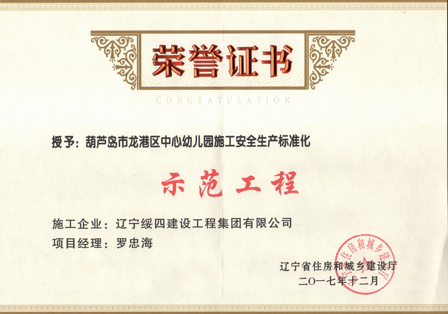 龍港區(qū)幼兒園施工安全生產(chǎn)標(biāo)準(zhǔn)化榮譽(yù)證書(shū)