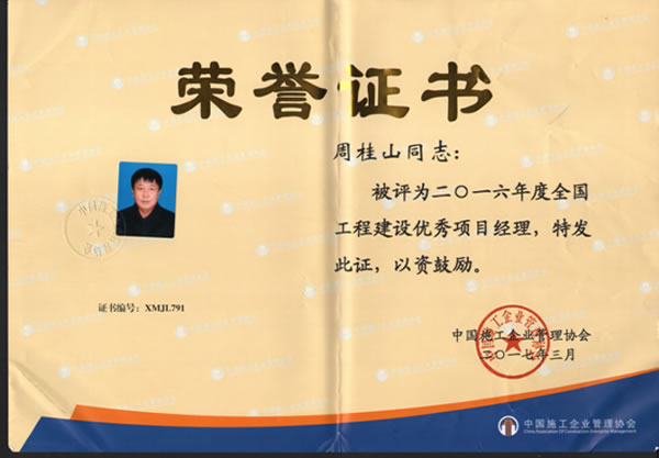 大會表彰了2016年度獲得全國優(yōu)秀施工企業(yè)稱號的單位并頒發(fā)了證書。我公司榮獲“2016年度全國優(yōu)秀施工企業(yè)”稱號,周桂山同志榮獲“全國工程建設(shè)優(yōu)秀項(xiàng)目經(jīng)理”稱號。