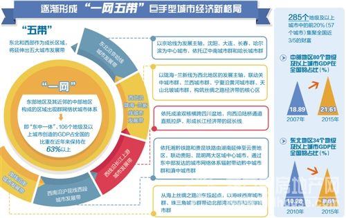 從城市層面GDP空間分布及變化來看,中國東中一體與“一網五帶”經濟空間新格局進一步凸現。主要表現在:第一,中心城市的經濟集聚引領作用進一步增強,285個地級及以上城市中的前20%(57個城市)集聚全國近3/5的財富。第二,中部地區(qū)憑借中心城市的有力支撐正在不斷崛起,東北地區(qū)由于中心城市支撐作用下降而出現持續(xù)下滑。第三,“一網五帶”的“巨手型”城市中國經濟空間格局進一步顯現。東中部多中心城市群網中106個地級及以上城市創(chuàng)造的GDP占全國的比重在近年來保持在63%以上。西線沿長江上游城市發(fā)展帶GDP比重持續(xù)增加,2015年達到了6.28%,有趕超東北沿京哈線城市發(fā)展帶的可能。西北沿隴海蘭新線城市發(fā)展帶、西南沿滬昆線西段城市發(fā)展帶、南線沿海城市發(fā)展帶在全國的GDP比重盡管相對較小,但總體上呈增加趨勢。
