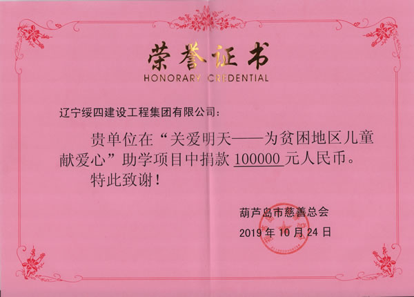 2019年10月24日,我集團(tuán)積極參與葫蘆島市教育局、葫蘆島市民政局、葫蘆島市慈善總會(huì)“關(guān)于開展‘關(guān)愛明天——為貧困地區(qū)兒童獻(xiàn)愛心’公益活動(dòng)的倡議”活動(dòng),捐款人民幣拾萬元整。