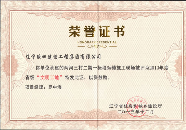 2013年12月由羅忠海項(xiàng)目部承建的兩河三村二期一標(biāo)段6#樓施工現(xiàn)場(chǎng)被遼寧省住房和城鄉(xiāng)建設(shè)廳評(píng)為2013年度省級(jí)“文明工地”。