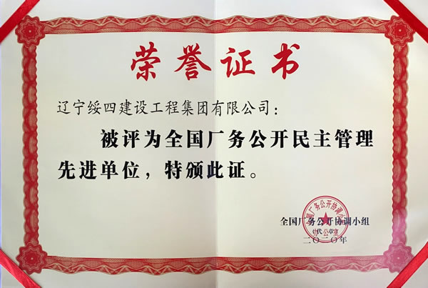 2020年8月,遼寧綏四建工集團喜獲“全國廠務(wù)公開民主管理先進單位”榮譽稱號。