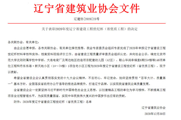 2020年12月30日,遼寧省建筑業(yè)協(xié)會發(fā)布了“關(guān)于表彰2020年度遼寧省建設(shè)工程世紀杯(省優(yōu)質(zhì)工程)和遼寧省建設(shè)工程優(yōu)質(zhì)結(jié)構(gòu)的決定”。2020年,集團所有參評項目在前期各關(guān)聯(lián)協(xié)會、有關(guān)單位推薦的基礎(chǔ)上,經(jīng)專家組材料審核、現(xiàn)場和會議評價,遼寧省建設(shè)工程質(zhì)量評審委員會、世紀杯專家組認定,最終進行公示。集團2項工程榮獲 “2020 年度遼寧省建設(shè)工程世紀杯”,14項工程榮獲“2020年度遼寧省建設(shè)工程優(yōu)質(zhì)結(jié)構(gòu)”榮譽稱號。此次榮譽的獲得是對集團堅持精細化管理、不斷提質(zhì)增效的肯定。