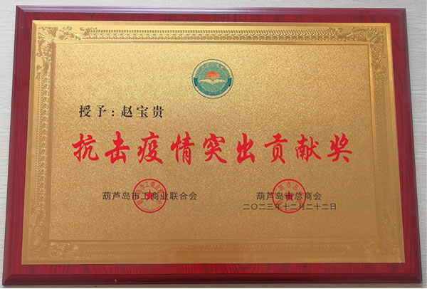 2023年12月22日,葫蘆島市工商業(yè)聯(lián)合會、葫蘆島市總商會共同授予綏四建工集團(tuán)董事長趙寶貴“抗擊疫情突出貢獻(xiàn)獎”。