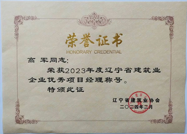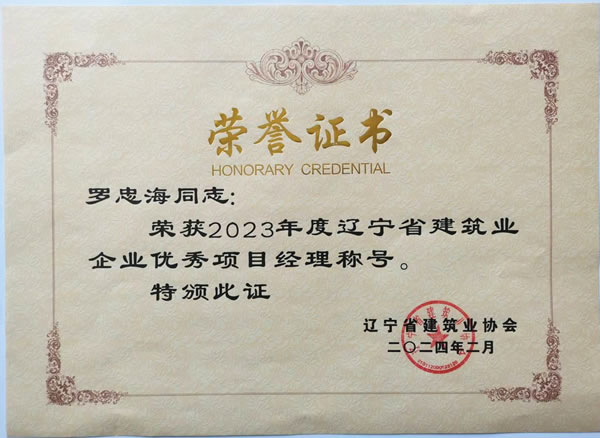 遼寧綏四建設(shè)工程集團有限公司的高軍、羅忠海、韓凱夫三名同志被評為2023年度遼寧省建筑業(yè)企業(yè)優(yōu)秀項目經(jīng)理,并于2024年5月獲得遼寧省建筑業(yè)協(xié)會頒發(fā)的榮譽證書。