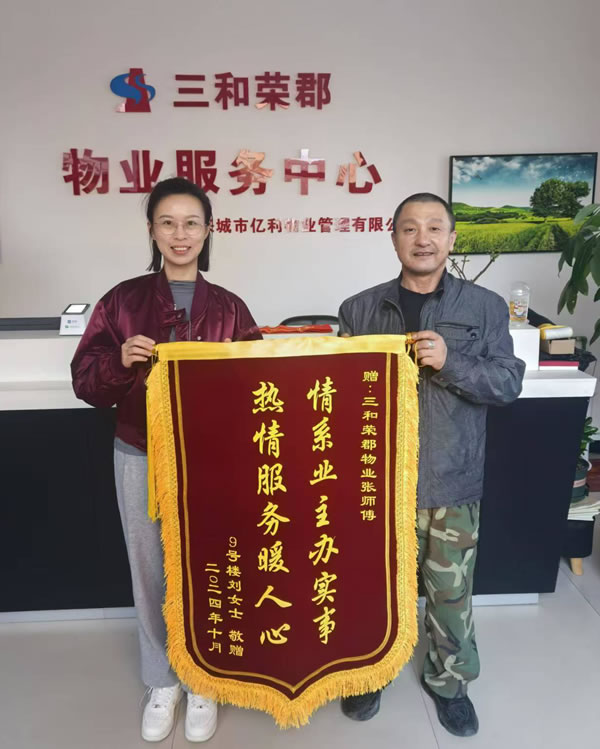 10月25日,業(yè)主劉女士將一面繡有“情系業(yè)主辦實(shí)事 熱情服務(wù)暖人心”字樣的錦旗送到了三和榮郡物業(yè)服務(wù)中心,對維修師傅張興軍及時(shí)解決水管漏水問題表示感謝。