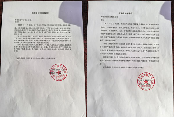 近期,綏中縣盛華園小區(qū)先后發(fā)生兩起火災(zāi)事故,所幸均被物業(yè)員工及時妥善處理,成功避免了重大人員傷亡和財產(chǎn)損失,綏中鎮(zhèn)工人社區(qū)居委會為此向盛華園物業(yè)公司發(fā)來感謝信,對兩位員工的英勇行為表示高度贊揚(yáng)。