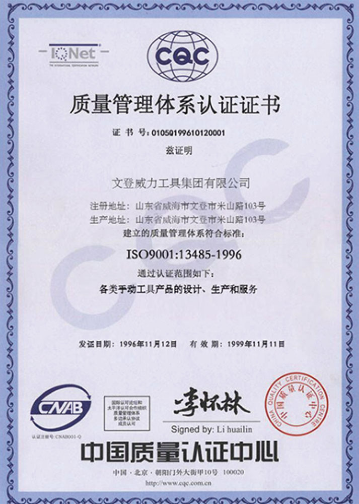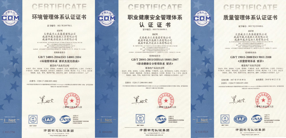 企業(yè)通過了ISO1400環(huán)境管理體系認(rèn)證;OHSAS1800職業(yè)健康安全管理體系認(rèn)證;活扳手、斷線鉗、管鉗產(chǎn)品通過了JIS認(rèn)證。