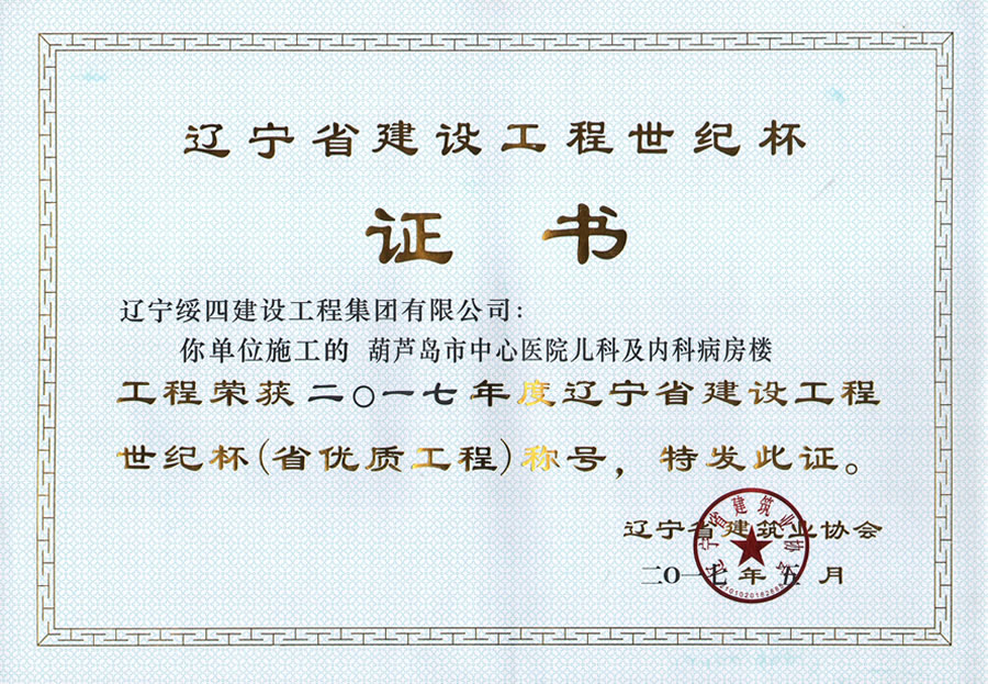 “葫蘆島市中心醫(yī)院兒科及內(nèi)科病房樓”榮獲2017年度遼寧省建設(shè)工程世紀杯稱號