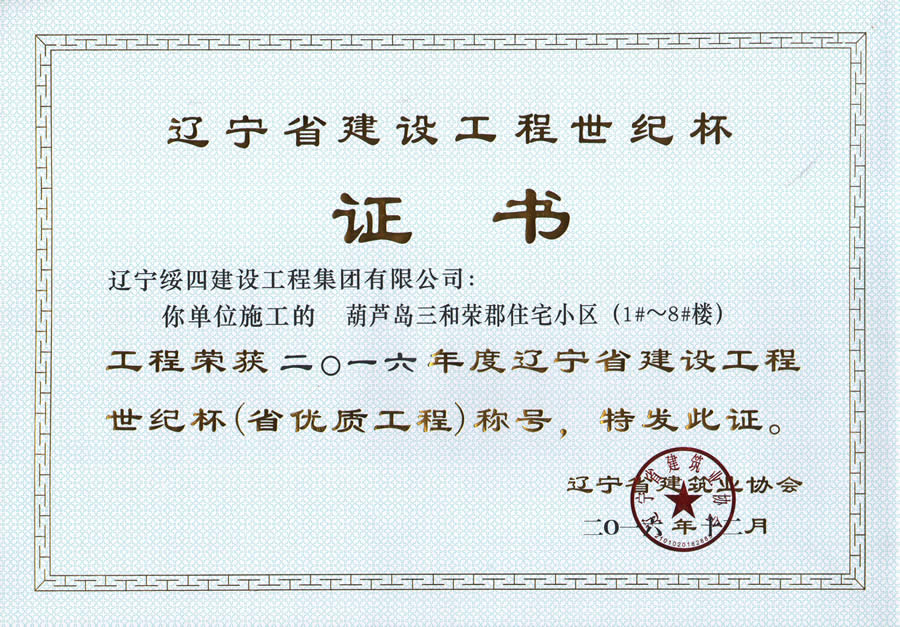 “葫蘆島三和榮郡住宅小區(qū)1-8#樓”榮獲2016年度遼寧省建設(shè)工程世紀(jì)杯稱號(hào)