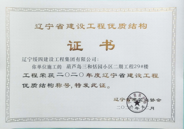 “葫蘆島三和恬園小區(qū)二期工程29#樓”榮獲2020年度遼寧省建設(shè)工程優(yōu)質(zhì)結(jié)構(gòu)稱號