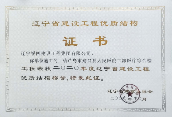 “葫蘆島市建昌縣人民醫(yī)院二部醫(yī)療綜合樓”榮獲2020年度遼寧省建設工程優(yōu)質(zhì)結構稱號