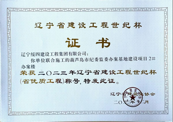 葫蘆島市紀委監(jiān)委辦案基地建設項目2#辦案樓 榮獲2023年遼寧省建設工程世紀杯(省優(yōu)質工程)稱號