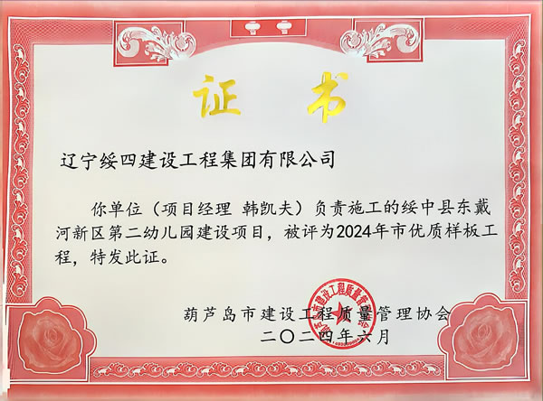綏中縣東戴河新區(qū)第二幼兒園建設(shè)項目被評為2024年市優(yōu)質(zhì)樣板工程