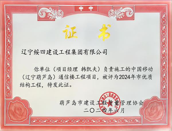 中國移動(遼寧葫蘆島)通信樓工程項目被評為2024年市優(yōu)質結構工程