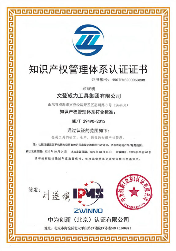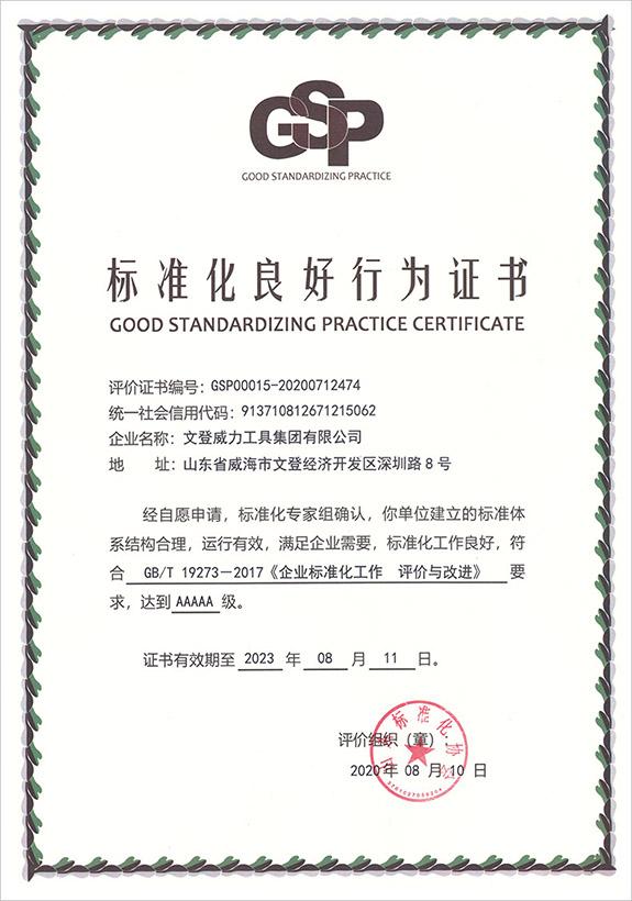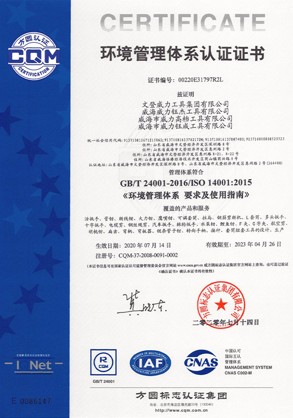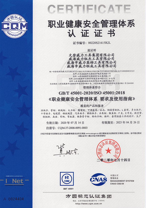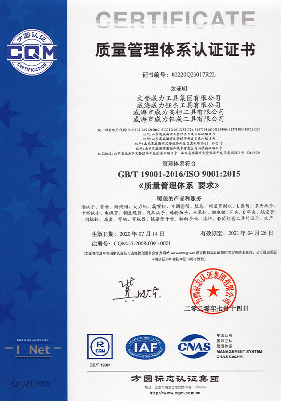1996年,威力集團率先在五金制品行業(yè)通過了ISO9001質量體系認系,隨后又相繼通過了OHSAS18001職業(yè)健康認證、ISO14001環(huán)境體系認證、韓國KS、日本JIS、德國VPA/GS認證。